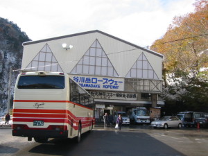 湯檜曽川にかかる土合橋を渡り、遭難者慰霊碑のある公園の脇を通って、ロープウェイの土合口駅に到着する。